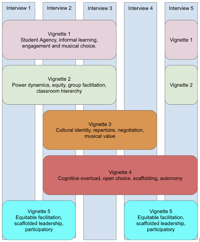 I share vignettes and insights throughout this article, drawn from diverse teaching contexts and presented not as universal claims but as stimuli for practitioner reflection. These vignettes are fictional composites of themes that have emerged from semi-structured interviews with five teachers. Fictionalisation serves both an ethical and analytical purpose, protecting identities through abstraction while enhancing narrative coherence (Ellis et al. 2011; Barone and Eisner 2012; Leavy 2020). I chose this approach due to its flexibility and ability to elicit context-specific insights while maintaining consistent themes (Kallio et al. 2016). The five teachers interviewed were curriculum leaders in music, and the interview questions were open-ended and centred on curriculum development and inclusivity. Key themes of the interview were identified through thematic analysis and validated by the participants (Braun and Clarke 2006). This was achieved by offering summaries of thematic interpretations and inviting participants to confirm the validity of the themes. Participants had an opportunity to provide feedback and offer clarification, thereby supporting the credibility and co-construction of meaning. Consent was obtained for the interviews, along with the right to withdraw at any time. These vignettes have been created to reflect shared experiences, perspectives, and tensions that are not my own, but also capture the broader concerns across music education that arose during the interviews. Figure 1 illustrates the key themes of the interviews and how each vignette connects to these identified themes.