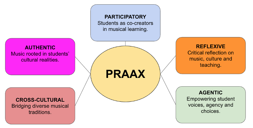 In my reflections on practice, sustained engagement with Regelski’s and Freire’s ideals over several years led to the development of the PRAAX model, comprising five strands: Participatory, Reflexive, Agentic, Authentic, and Cross-cultural. The concept emerged from my reflective practice and research as a framework to support culturally responsive, justice-oriented music education. Still in its early stages, PRAAX represents a working model-in-progress, shaped by iterative practice cycles, reflection, and student dialogue inspired by advocates of action research (Kemmis and McTaggart 1988). It is not presented here as a fully established theory or framework, but as a pedagogical reflection tool grounded in the praxial philosophy of Regelski (2016) and Freire’s critical pedagogy (1972).