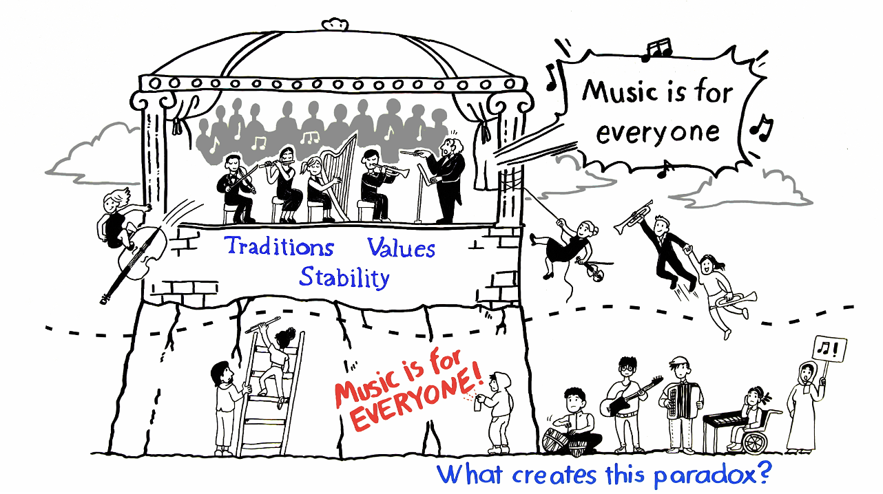 CLICK HERE TO WATCH: https://www.youtube.com/watch?v=BJY6T7Y_rKM Video 1 transcription. Let’s take a critical look at the music education system. Isn’t it acting as if it’s an exclusive universe, where institutions define what quality and expertise mean. The system tends to focus on preserving traditions, values, and stability – and that emphasis on reproduction excludes certain people, some practices, new locations, and more imaginative uses of music. At the same time, the system preaches that music is for everyone while research shows that many remain excluded from it. What creates this paradox? Well, when the music education system stubbornly concentrates on sustaining its status quo, it overlooks how to engage with societal challenges in responsible ways. It doesn’t recognise how people could transform the system itself. Without challenging this paradox, music education will lose its opportunities to resonate with the people of our changing world. Video 1: Challenges of music education.[1] On the Problem of “Loving Music till it Hurts”