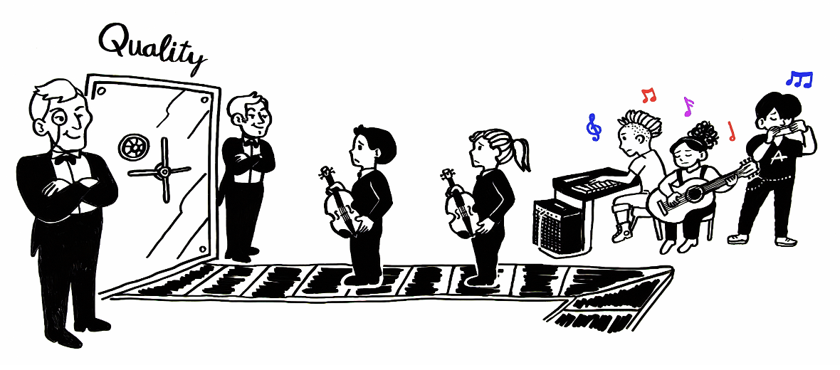 CLICK HERE TO WATCH: https://www.youtube.com/watch?v=DcfgKQkHHYc Video 2 transcription. In the conservatoire system, quality is safeguarded by experts in a competitive setup. Children and young people are expected to conform to preserving the system instead of exploring musical possibilities in personally and socially resonant ways. Does the system serve children or are children serving the system? The narrow notions of music and quality do not fully take into account music’s societal possibilities. What if the conservatoire system were more caring? Could it offer diverse pathways for children and young people without jeopardizing their opportunities to become professionals? Imagine a music education system that valued more radical differences! |